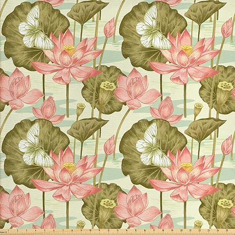 Lunarable Japanese Fabric By The Yard Exotic Vintage Lotus Flower Buds Stems In Pond Flying Butterfly Oriental Style Decorative Fabric For